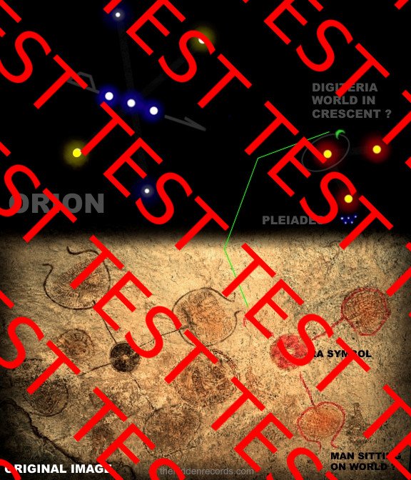This is the only original rock painting image (below) that matches the earliest Church renditions of the cross of Orion showing the way in alignment to the three Sigui stars coloured red to show they are different, suggesting perhaps they are sun-like, as a Trinity it is absolutely awe inspiring. It also shows the crescent Digiteria world linked to the Sigui star and uses a Ra symbol in red pigment like in Egypt. Compare the crescent knowledge detail to the next image that follows which carries the explanation. If you look close at the image note the man standing on Earth bottom left and bottom right, is that a human sitting on a world associated with another Sigui star? (ref) Image online verification