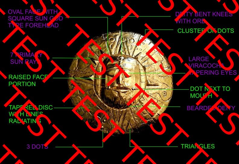 The detail illustrated above in green is the well known detail repeated in story upon story who speak of the Gold disc, all of which reference other books who then reference an ‘inca elder’ who I was unable to trace historically. The detail in purple is the detail that the previous reconstruction artists chose to ignore, perhaps commissioned by elite who wanted such detail to be omitted. I have replicas available to the public on this full sized 60cm disc (ref).