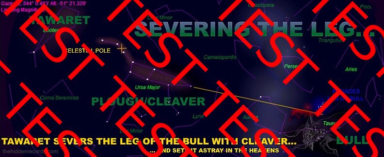 In the image below follow the legendary story from Bootes as Taweret with the cosmic cleaver (also a Plough) who as a teaching tradition, cut the leg of the bull from Taurus the bull. See the previous image now where parts 3 and 4 are now complete as one completely flowing and aligned deciphered message.
